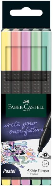 Faber-Castell Grip tűfilc, 0.4 mm, 5 db / készlet Vízbázisú tinta és ételfesték filcek. Hosszú hegye fémmel borított. Írásvastagság: 0,4 mm. Ideális rajzoláshoz és műszaki rajzoláshoz vonalzóval. Szabadalmaztatott markolatzóna a könnyű, csúszásmentes fogásért. Háromszög alakú ergonomikus forma. A tinta a legtöbb textíliáról letisztítható. 5 pasztellszínből álló készlet.