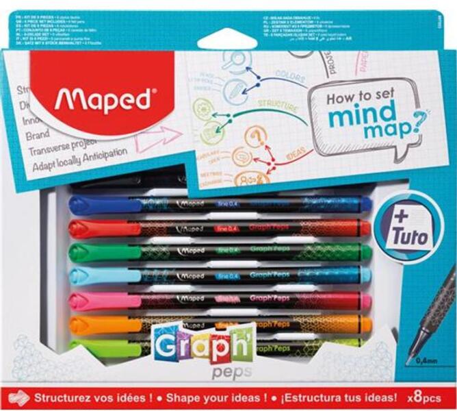 Maped Tűfilc készlet, 0, 4 mm, MAPED "Graph`Peps - How to Mind Map Box", 8 különböző szín (897553)