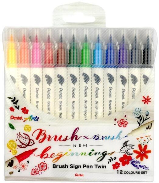 Az új, kétvégű Pentel Brush Sign Pen ecsettoll a legjobb 12 színből álló skáláját magába foglaló szett. Minden tónusból 1-1 darabot tartalmaz a készlet. Akasztható és polcra is helyezhető.