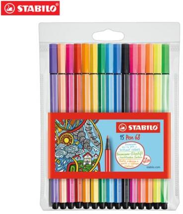 A STABILO Pen 68 15 db-os készlet tökéletesen illeszkedik a bullet naplózás, a jegyzetek, a vázlatkészítés és a kézi betűírás jelenlegi trendjeihez. De még a mandalák rajongóit, a festészet és rajzolás szerelmeseit is izgatja a kiváló minőségű "szál" sokoldalúsága. Az alkotó és (hobbi)művészek szeretik azt a sokféleséget, amellyel minden ötlet színesben megvalósítható. A robusztus tollhegy egyenletes színeloszlást biztosít, és ideális vastagabb vonalak rajzolásához és üres területek kitöltéséhez. A Pen 68 valóban meg fogja lepni teljesítményével – 24 óra kupak nélkül, vízzel mosható, szagtalan vízbázisú utántöltő, rendkívül tiszta és élénk színek.