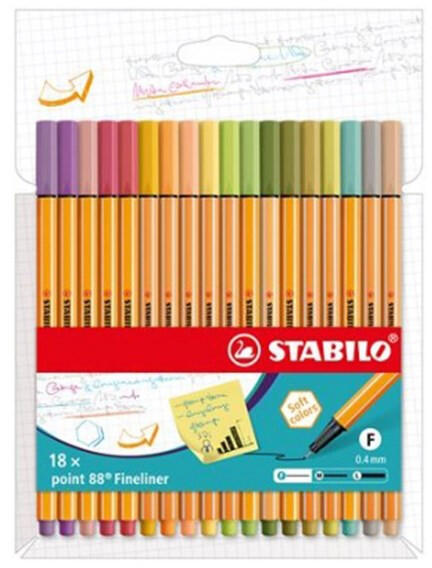 Az azonnal felismerhető STABILO point 88 tűfilc időtlen klasszikus! Több mint 6 milliárd darab kelt már el belőle, és a világ minden táján sokak kedvence. Akár a jegyzeteidet szeretnéd tagolni színes aláhúzással, külön megjegyzésekkel, vagy sokszínű szövegeket szeretnél készíteni, a 18 ragyogó színt, kínáló készletben megtalálsz minden árnyalatot, amire szükséged lehet. A STABILO point 88 tűfilc 0,4 mm-es vonalvastagsága és a kiváló minősége megbízható eszközzé teszi, és használata minden nap örömet okoz. Színek: aranysárga, lila, ciklámen, rózsaszín, bordó, piros, narancs, világos zöld, türkiz, sötét zöld, tengerkék, zöldeskék, sötét kék, halvány barna, sötét barna, szürke, fekete.